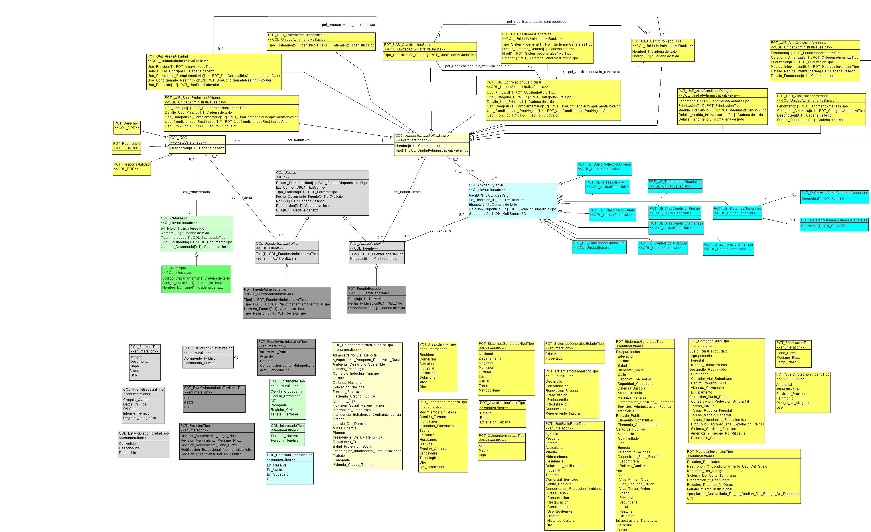 El modelo extendido LADM_COL_v_2_0_0_Ext_POT (Plan de Ordenamiento Territorial (POT) permite gestionar la información relativa a la formulación de los planes de ordenamiento territorial, estandarizando los objetos territoriales, dominios, atributos y relaciones, con el objetivo de facilitar el intercambio de datos entre los diferentes niveles territoriales y sectoriales del país.