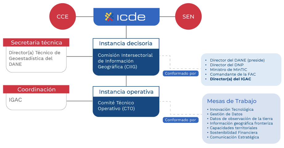 La nueva estructura organizacional de la ICDE se diseñó con el propósito de fortalecer la articulación entre los actores vinculados mediante la creación de dos instancias. Esta estructura por primera vez dota a la ICDE de un nivel decisorio, de tipo colegiado, que definirá su visión estratégica para el futuro, al tiempo que preserva la responsabilidad funcional de coordinación que tradicionalmente ejercía el IGAC, ahora en un doble rol de entidad articuladora de ambas instancias, y ejecutora de los créditos multilaterales en los aspectos relacionados con la ICDE.