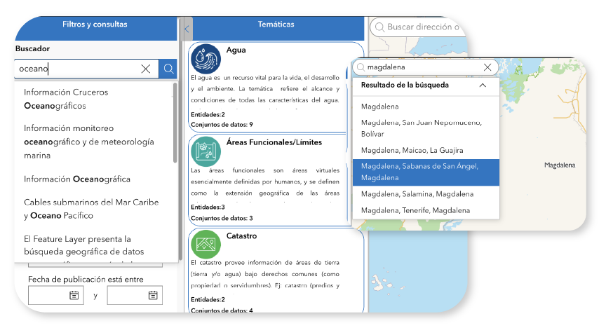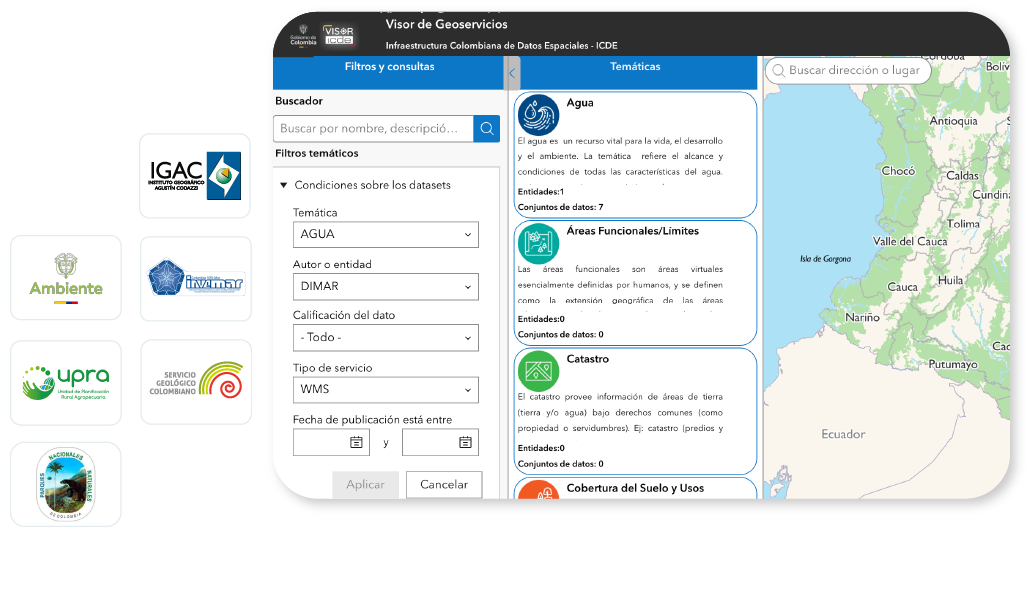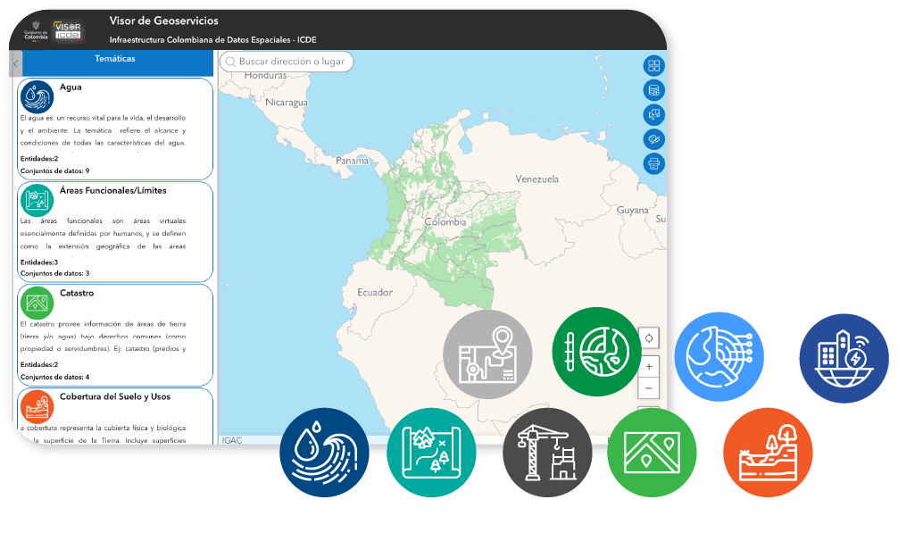El Visor Geográfico ICDE es una herramienta diseñada para explorar, buscar y visualizar geoservicios proporcionados por las entidades productoras de información geográfica, como servicios disponibles en formatos: WMS, WFS, CSW, WMTS, entre otros.